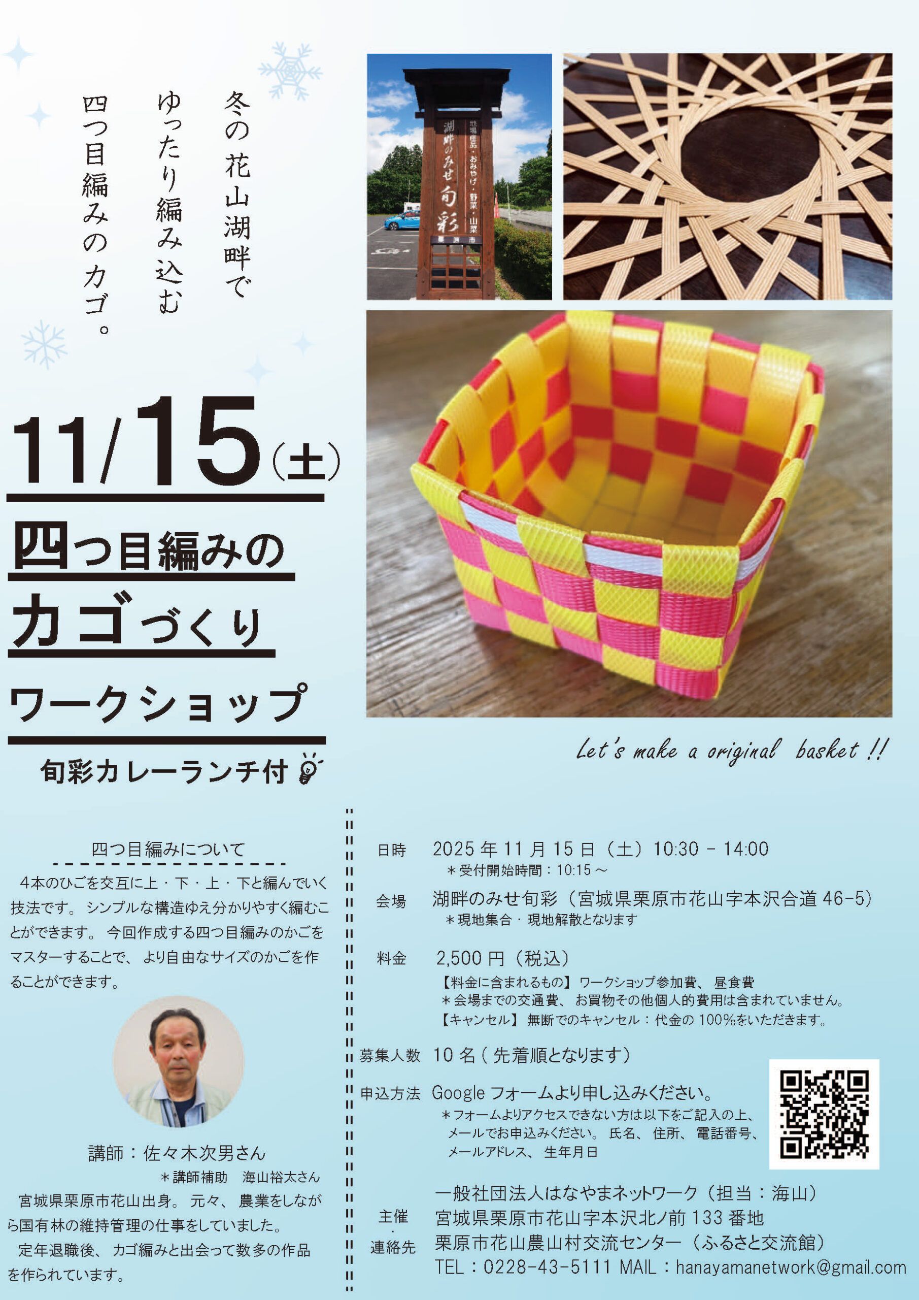 11月15日(土)、湖畔のみせ旬彩にて「四つ目編みのカゴづくり」ワークショップが開催されます!四つ目編みは、4本のひごを交互に「上・下・上・下」と編んでいく、シンプルでわかりやすい伝統的な技法です。初めての方やお子さまから大人の方まで、安心してご参加いただけます。今回のワークショップでこの四つ目編みのカゴをマスターすれば、ご自宅でも自由なサイズのかご作りに挑戦できるようになります。この機会に、カゴ編みの楽しさに触れてみませんか?
